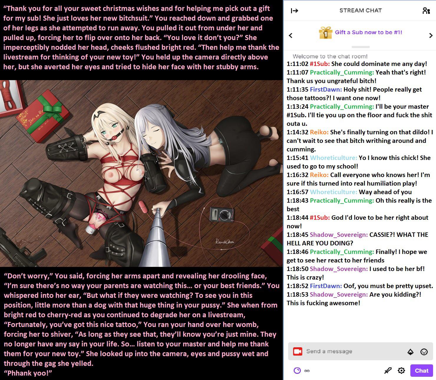 Showing off her new bitchsuit on Livestream. Keeping the sub alive (Part 11)