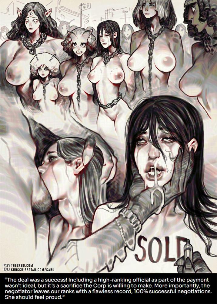 Image 1: “A simple mission, really: enter negotiations with the Nova Orbit Cartel and secure safe passage through their territory. An easy task for a high-ranking negotiator. Compared to the Royal Fleet’s bureaucrats, a few backwater thugs won’t be a challenge.” Image 2: “The deal was a success! Including a high-ranking official as part of the payment wasn’t ideal, but it’s a sacrifice the Corp is willing to make. More importantly, the negotiator leaves our ranks with a flawless record, 100% successful negotiations. She should feel proud.” \---- You can see my other works here: [https://www.reddit.com/r/SabuArt](https://www.reddit.com/r/SabuArt)