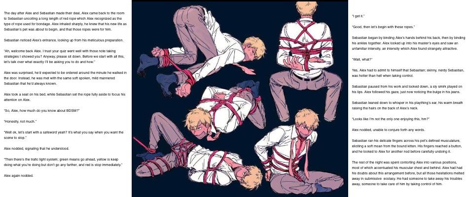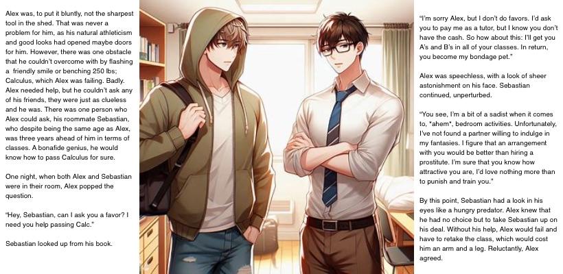 First image is ai generated, second is https://www.pixiv.net/member_illust.php?mode=medium&illust_id=63953669 Just starting to dip my toes into erotic writing so let me know if this sucks. I noticed the criminal lack of M/m content, especially because most msub content is sissy/feminization, which is not my cup of tea, so I figured I’d do something about it. However, it’s kinda hard to find msub art that’s not of a femboy and/or skinny twink, so Alex’s appearance will be absolutely inconsistent.